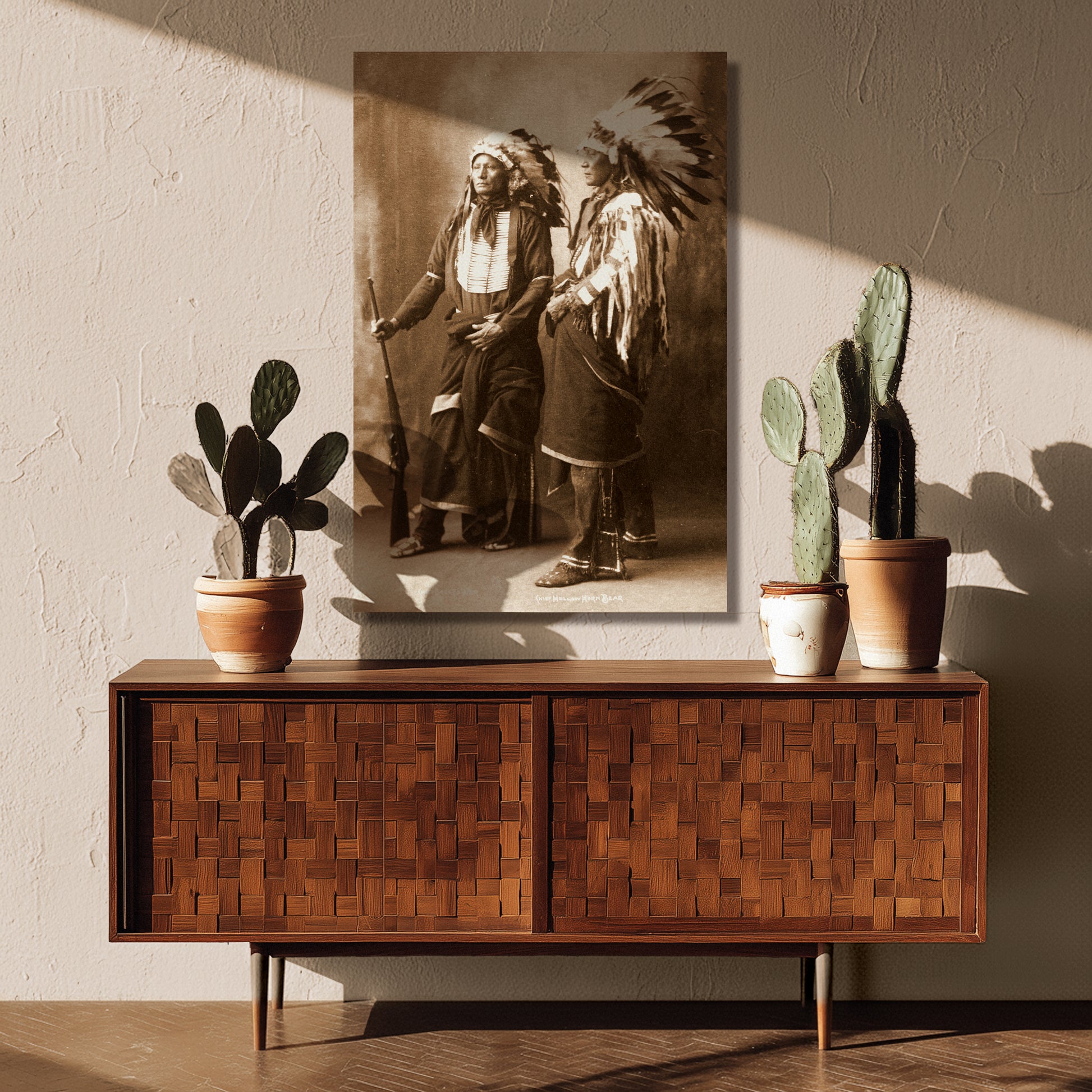 A museum-quality stretched canvas printed with a sepia-toned historical photograph. This portrait was originally photographed using platinum and paperboard. It carries quiet dignity and a sense of time-worn memory—warm browns, deep contrasts, and fine detail rendered with modern printing to keep the photograph’s character intact. Displayed on a slim 0.75" pine stretcher, the image wraps subtly over the edges for a gallery look that sits flush to the wall with included mounting hardware. It brings a contemplative, heritage-driven presence to living rooms, studies, or entryways, inviting slow looks and conversation about history and place. It depicts two chiefs with feather headdresses, Sioux, North American Indian people, and is an historic, digitally restored reproduction of an original from the period