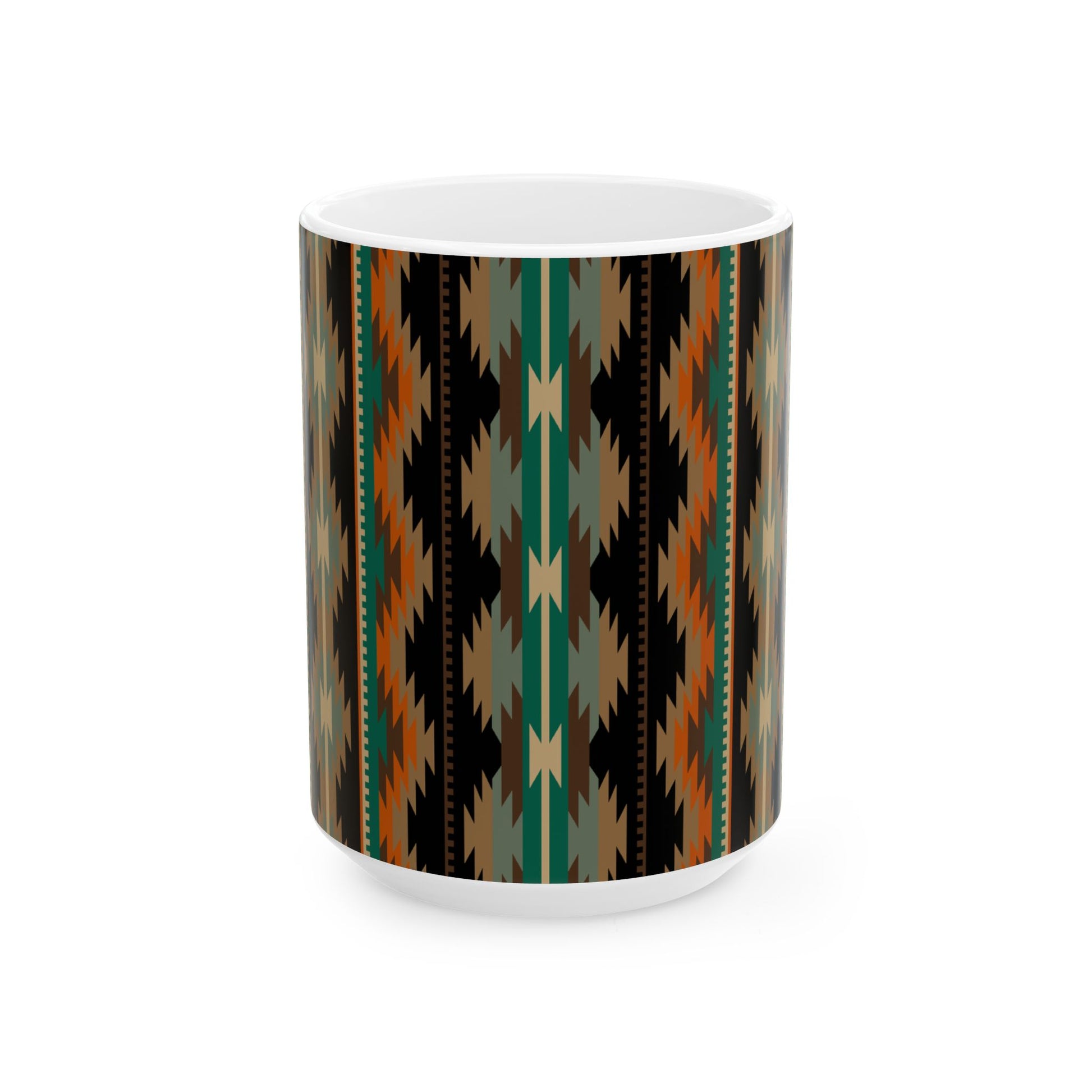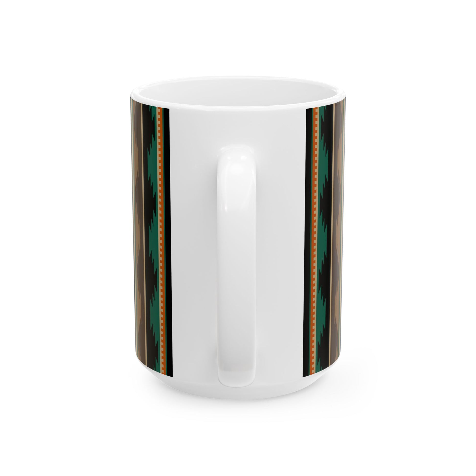 Wrap your morning ritual in warm, earthy geometry. This electrifying Rustic Cross pattern of the Southwestern Indigenous communities is sure to kick-start your morning—rust reds, deep greens, and sun-washed creams arranged in rhythmic diamonds and crosses. It feels like a quiet cabin sunrise or a road trip pause at a desert overlook: grounded, soulful, and quietly bold. The balanced C-handle sits comfortably in hand as the pattern wraps around the cup, bringing color and texture to coffee breaks, late-night study sessions, or conversations around the table. For someone who loves handmade vibes, travel-worn textiles, and designs that nod to traditional weaving, this mug adds a tactile, nostalgic presence to everyday moments and seasonal gatherings.