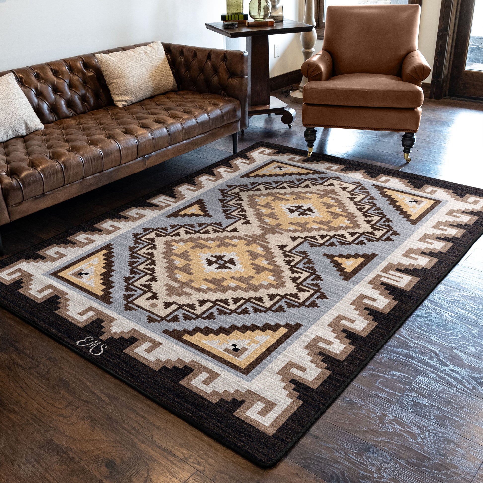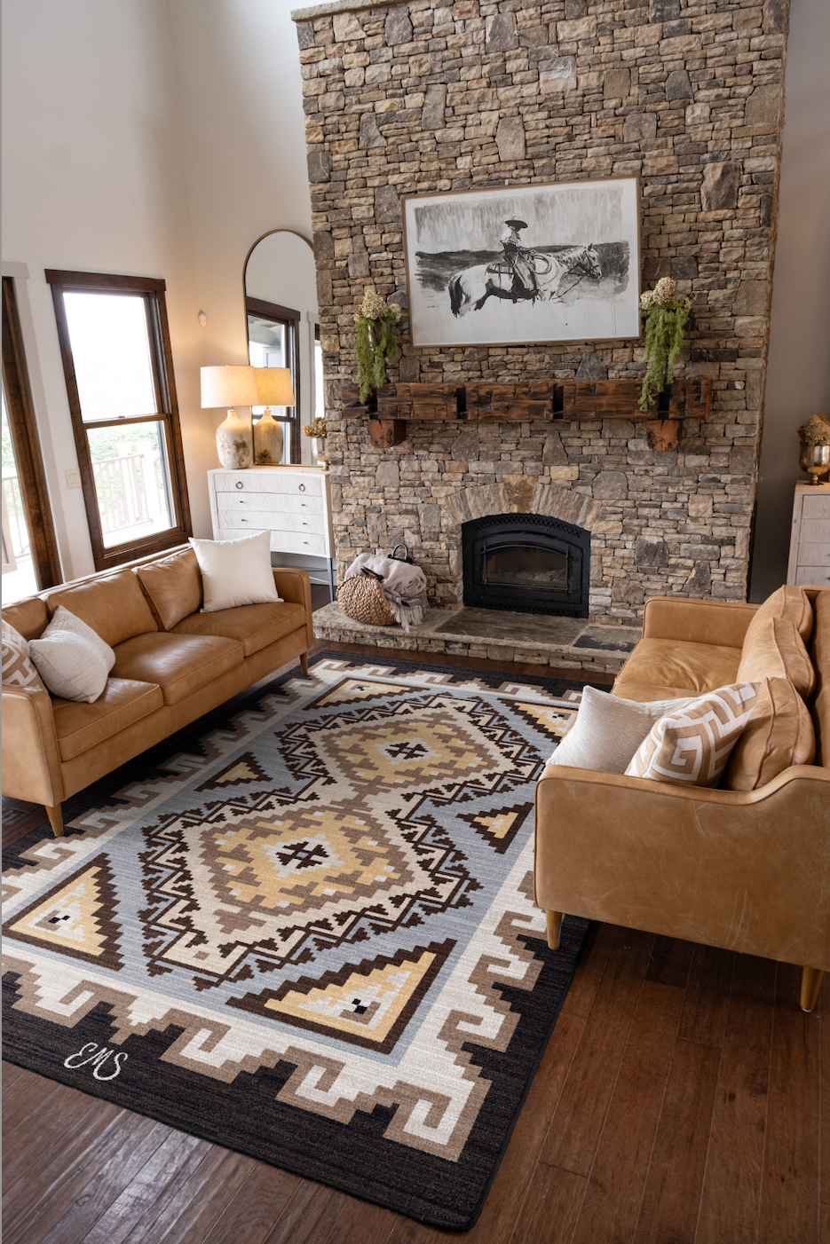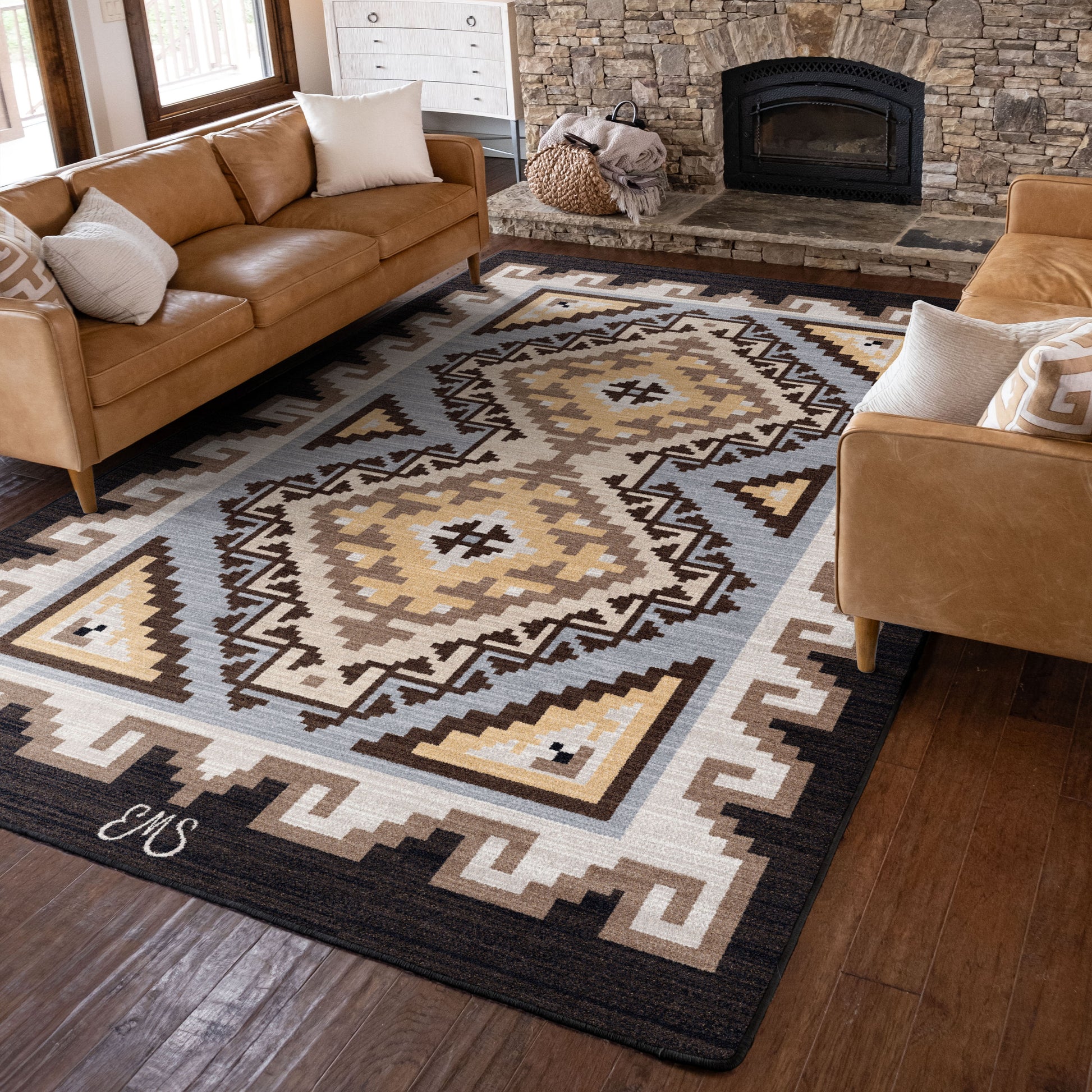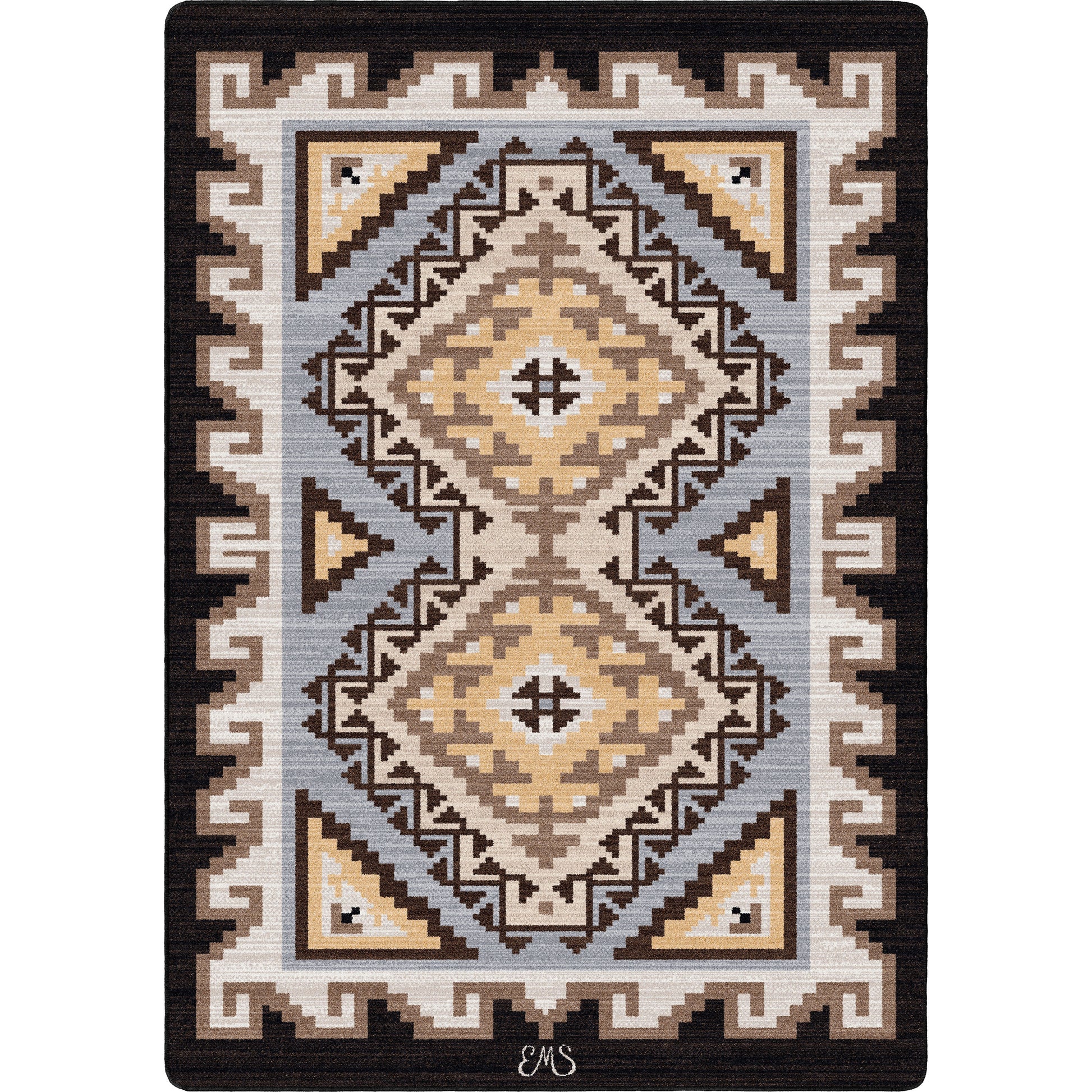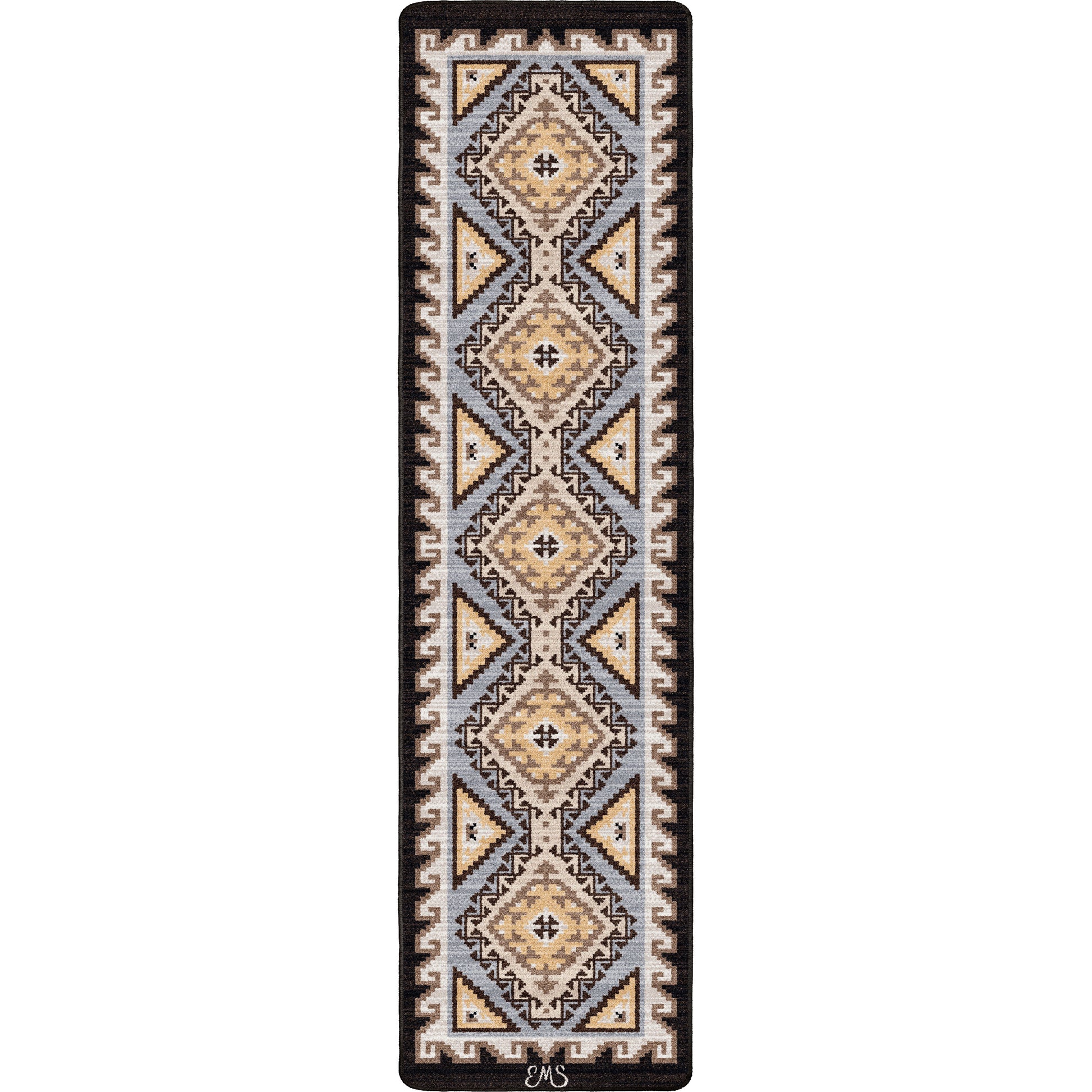 This one is dedicated to my mother. Without her teachings, I wouldn’t be who I am today with my weavings. When I was a teenager, my mom taught me the basic block textiles that could form a rug. When I started weaving I thought about all the designs she would create. I added her touch of two grey hill colors. As I also added a colorful shade of yellow to make the design pop. I made sure everything would be perfectly squared as I got to my middle design. Just as my mother would do to her weavings.
