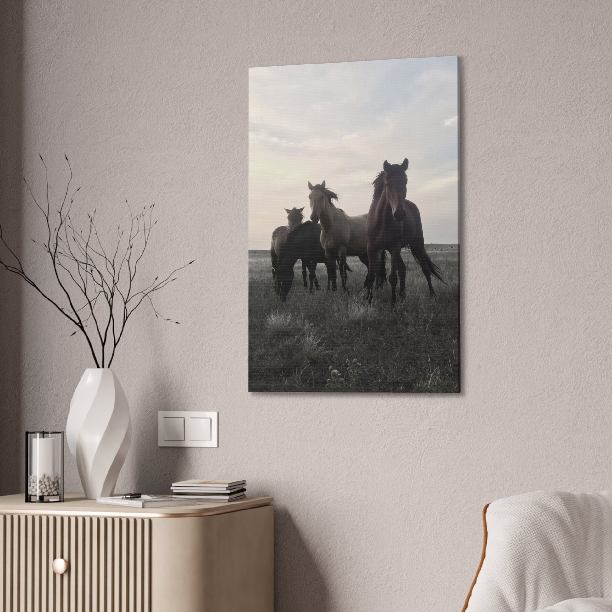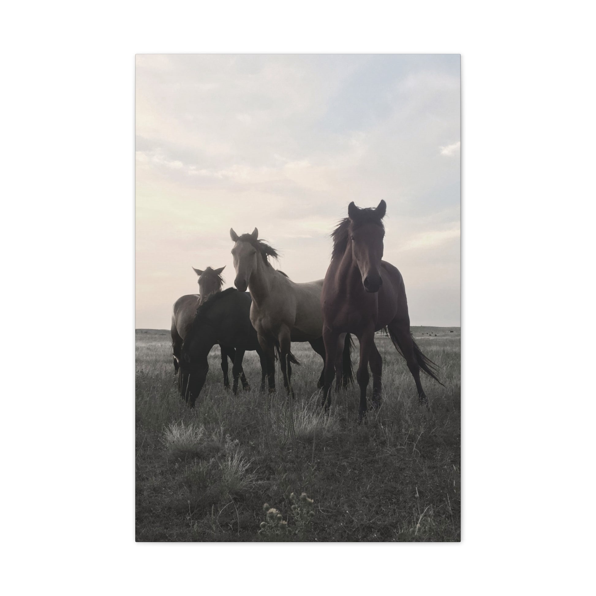 An original photo taken during a breathtaking moment: three horses step forward beneath a vast, pastel sky, with muted tones and soft contrast giving this moment a quiet, cinematic mood. Printed on a stretched canvas brings the wide-open prairie into your room!