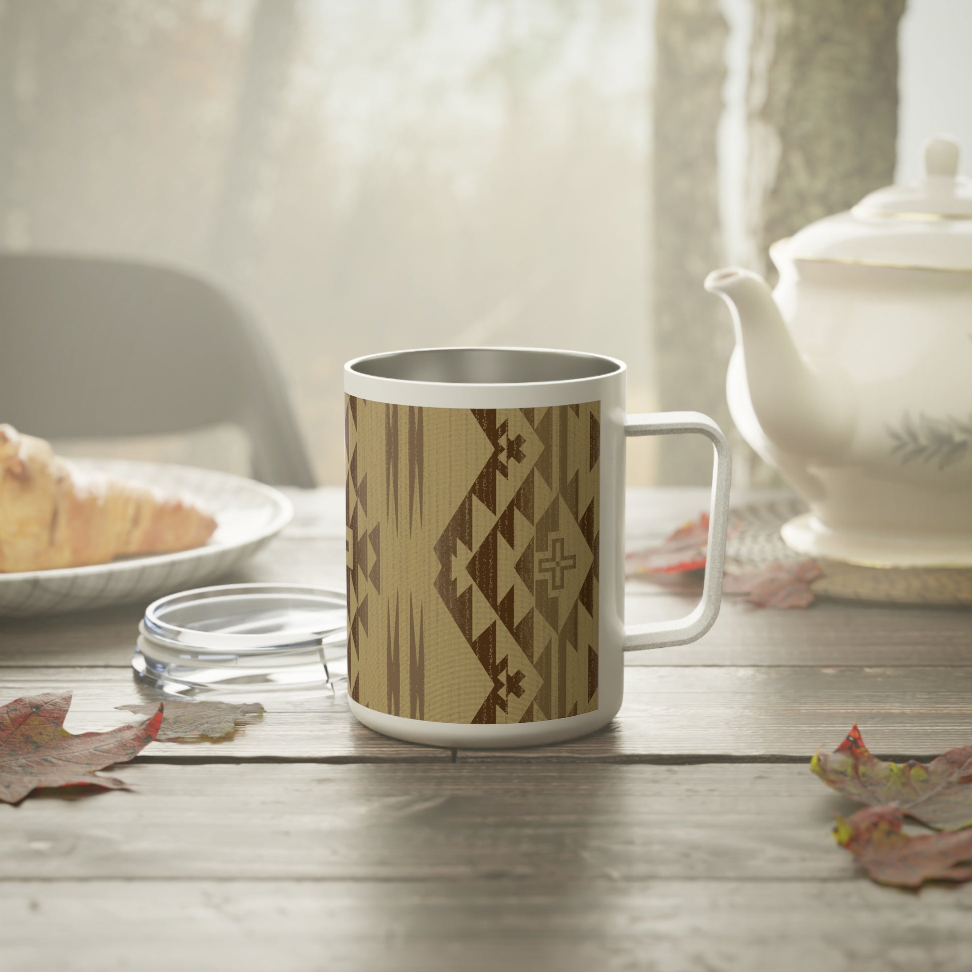 Warm, earthy, and quietly bold — this 10oz insulated coffee mug wraps your morning cup in a woven-blanket motif that feels like a slow sunrise at the cabin. The wood-toned geometric pattern and centered cross motif read like a handcrafted textile, giving each sip a little grounding ritual. It slides easily into daily routines: held on the porch, tucked into a tote for a short trip, or set beside a journal as you map out the day. The clear push-on lid keeps heat in and spills down, so you can savor coffee or tea without the rush. Durable stainless steel and a glossy wrap keep the design bright while the double-wall construction keeps drinks warm and your hands comfortable. This mug fits into a lifestyle that values heritage textures, simple comforts, and quiet, intentional moments — whether you’re easing into weekend rhythms or gifting a thoughtful piece for a new home.