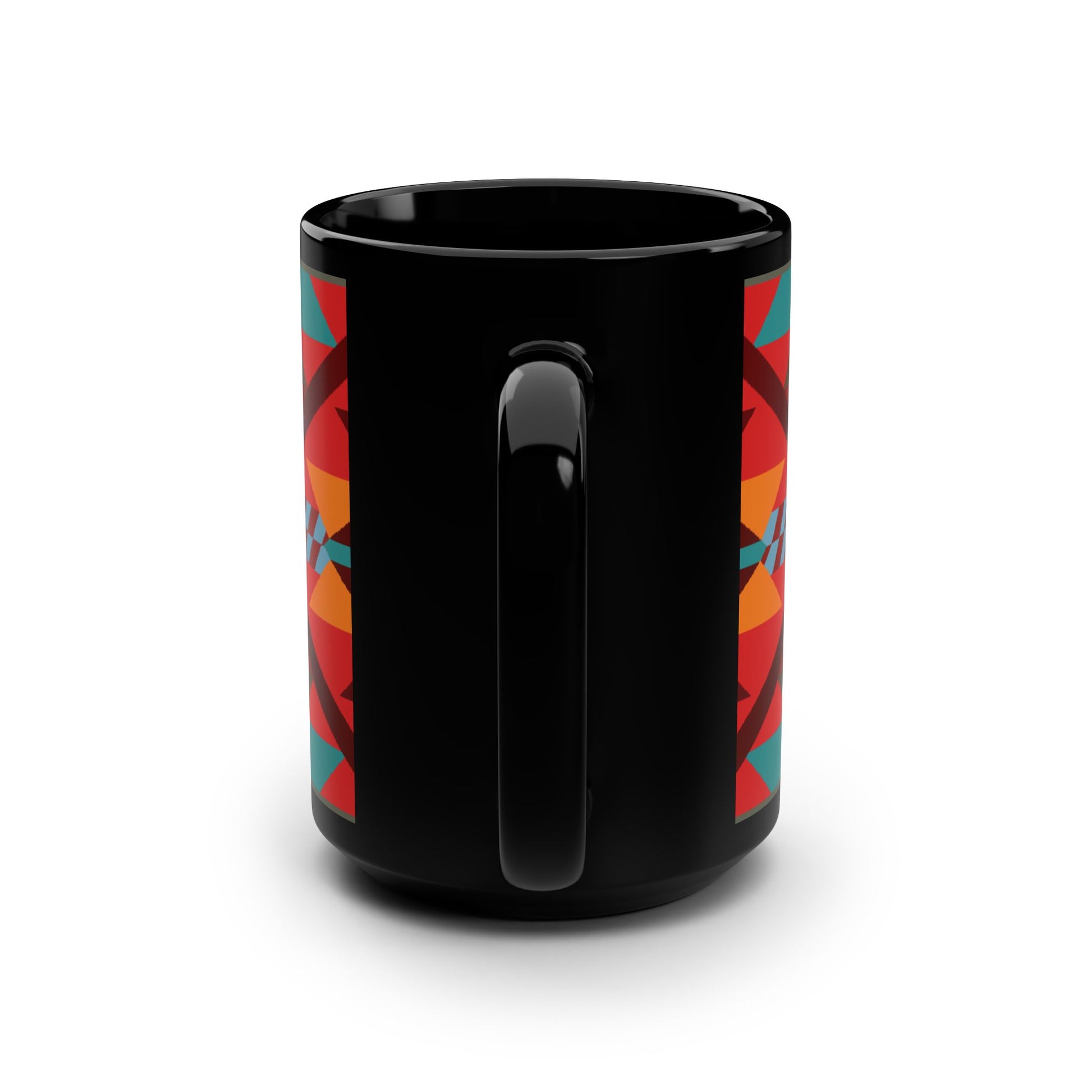 This 15oz glossy black ceramic mug brings warm, Southwestern energy to your morning ritual. Add a vibrant burst of sunset orange, deep river blue, sky blue, light denim, red, chestnut and wine geometric and cross patterns in your kitchen cupboard to kickstart your busy day.